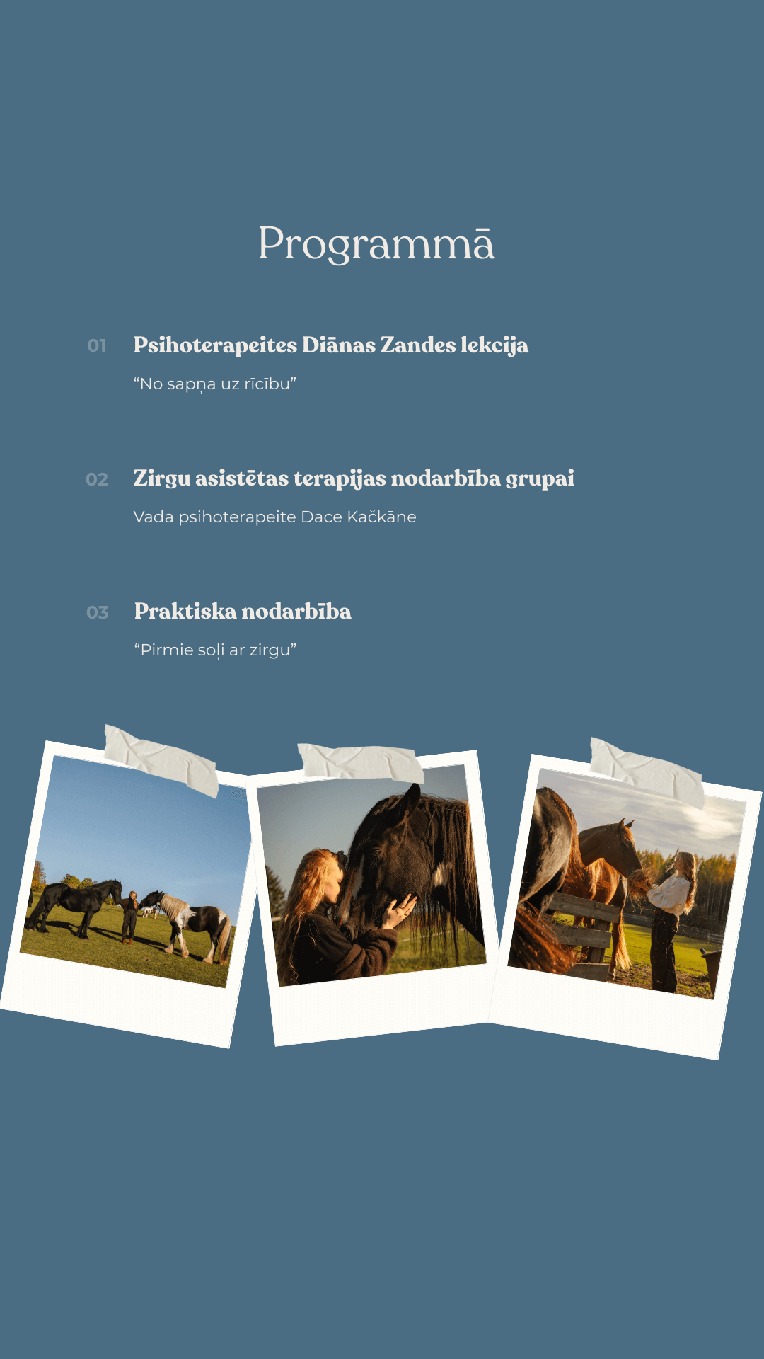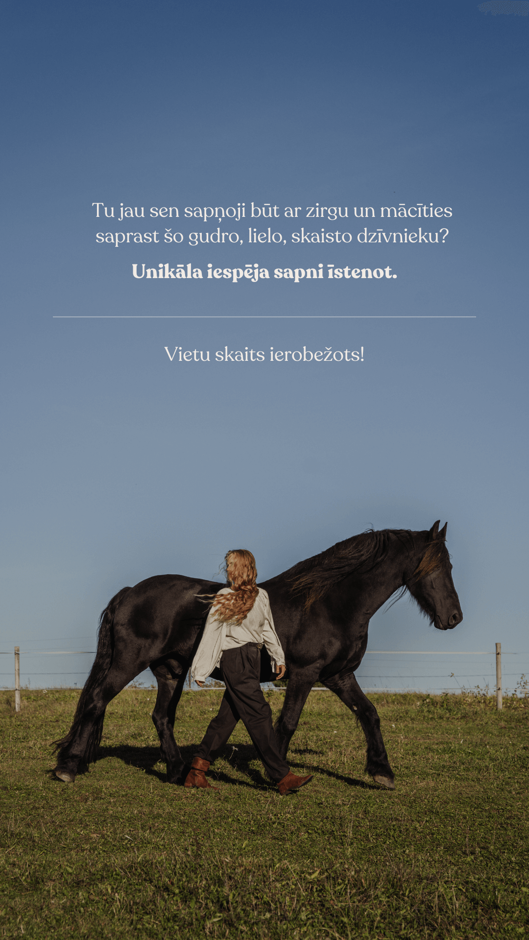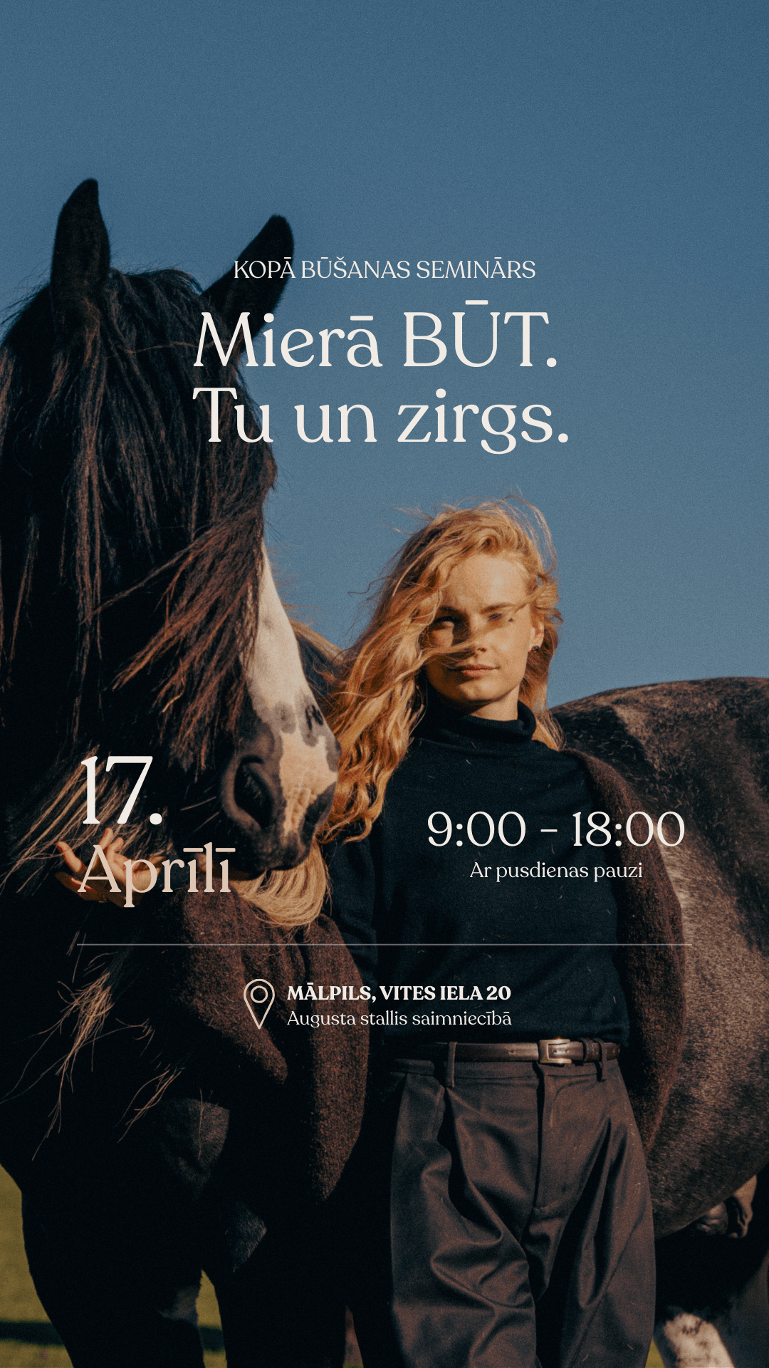 Lūgums ņemt vērā: maksimālais dalībnieku skaits 10 cilvēki. Būšana zirgiem mugurā nav paredzēta. Seminārs notiek nelielā grupā. Iepriekšēja pieredze ar zirgiem nav nepieciešama.
